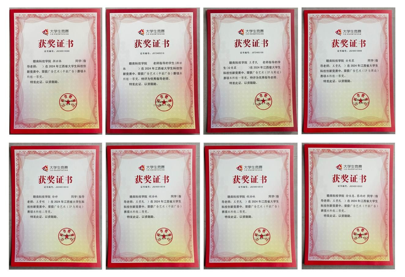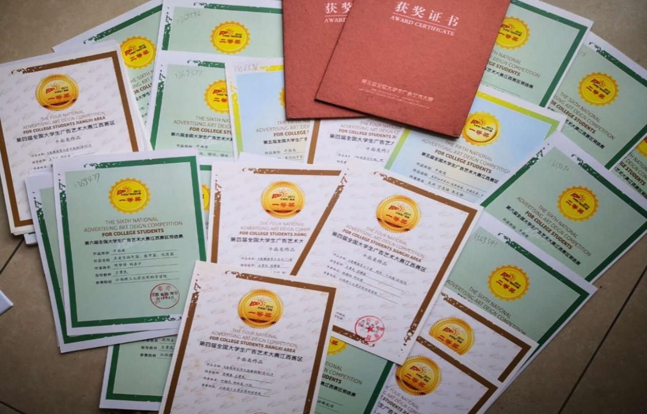 图二:历年在全国大学生广告艺术大赛中获奖证书。
