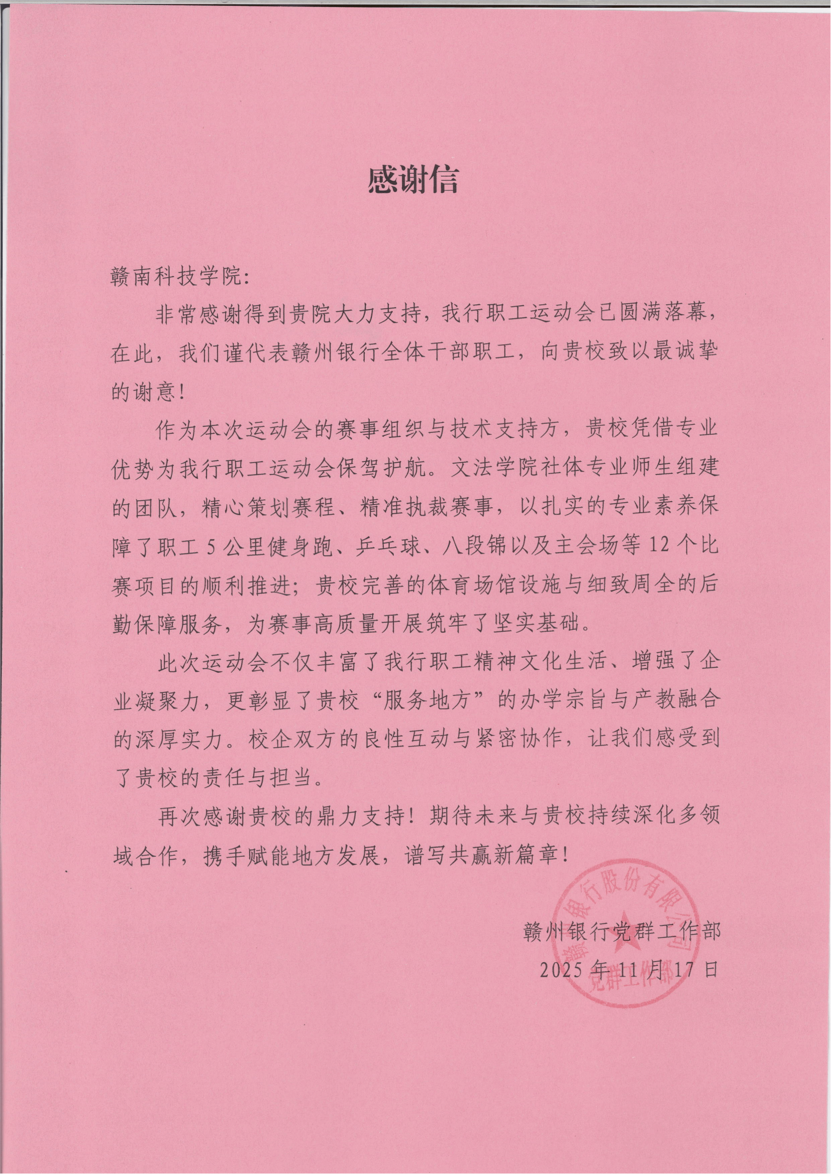 据悉,本届运动会历时七天,包括了5公里健身跑、乒乓球、八段锦、趣味项目等比赛项目,参与人数1000余人次,运动会结束后,赣州银行还专程发来感谢信,感谢学校的大力支持配合、感谢我院师生专业和细致的服务。