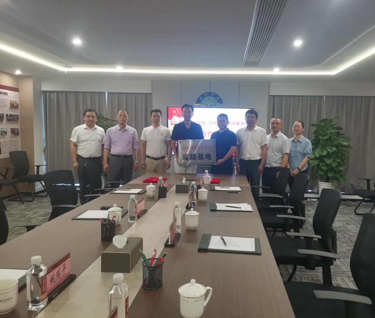 座谈会上,廖泽芳对李国鹏一行的到来表示热烈欢迎,并介绍了江西南芳律师事务所的基本现状、未来发展及岗位需求等情况。李国鹏介绍了学校的基本情况、历史沿革以及专业建设取得的成果。双方围绕法律服务人才培养、法律学术交流研讨、法学实践教学以及创新院所合作模式等方面进行了深入的交流与探讨。双方代表在会议室现场签订了校企合作协议,并为“yl6809永利检测中心实践基地”揭牌。