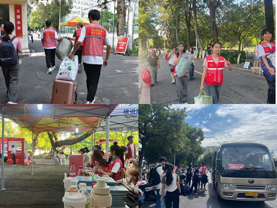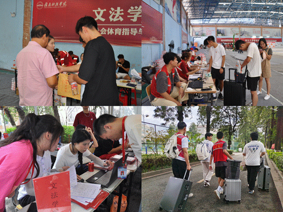 在迎新现场,迎接新生的工作如火如荼地进行着。从明确清晰的校园地图到秩序井然的校内引导,从后勤保障的物资输送到支援全场的行李搬运。校园内处处都活跃着青年志愿者们的身影。志愿者们接力行动,引导新生注册报到,协助新生搬运行李。