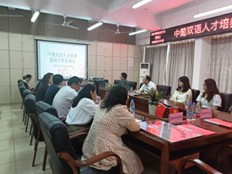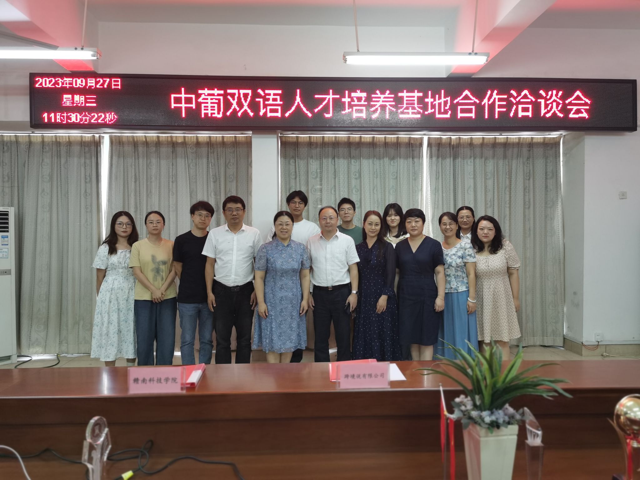 为加深学校与企业的沟通交流,推进校企深度合作,促进学科专业发展,助力学生未来发展。继7月29号我校葡语教师参观考查珠海横琴跨境说网络科技有限公司并就校企合作达成初步共识后,于9月27日上午,在主楼807会议室,召开中葡双语人才培养基地揭牌仪式及洽谈会。会议特邀教务办主任王水蓉,国交办主任涂敏出席,同时出席此次会议的还有珠海横琴跨境说网络科技有限公司副总裁罗兴一行,人文科学系主任高健婕,副主任何建军,葡语教研室全体教师和部分学生代表。