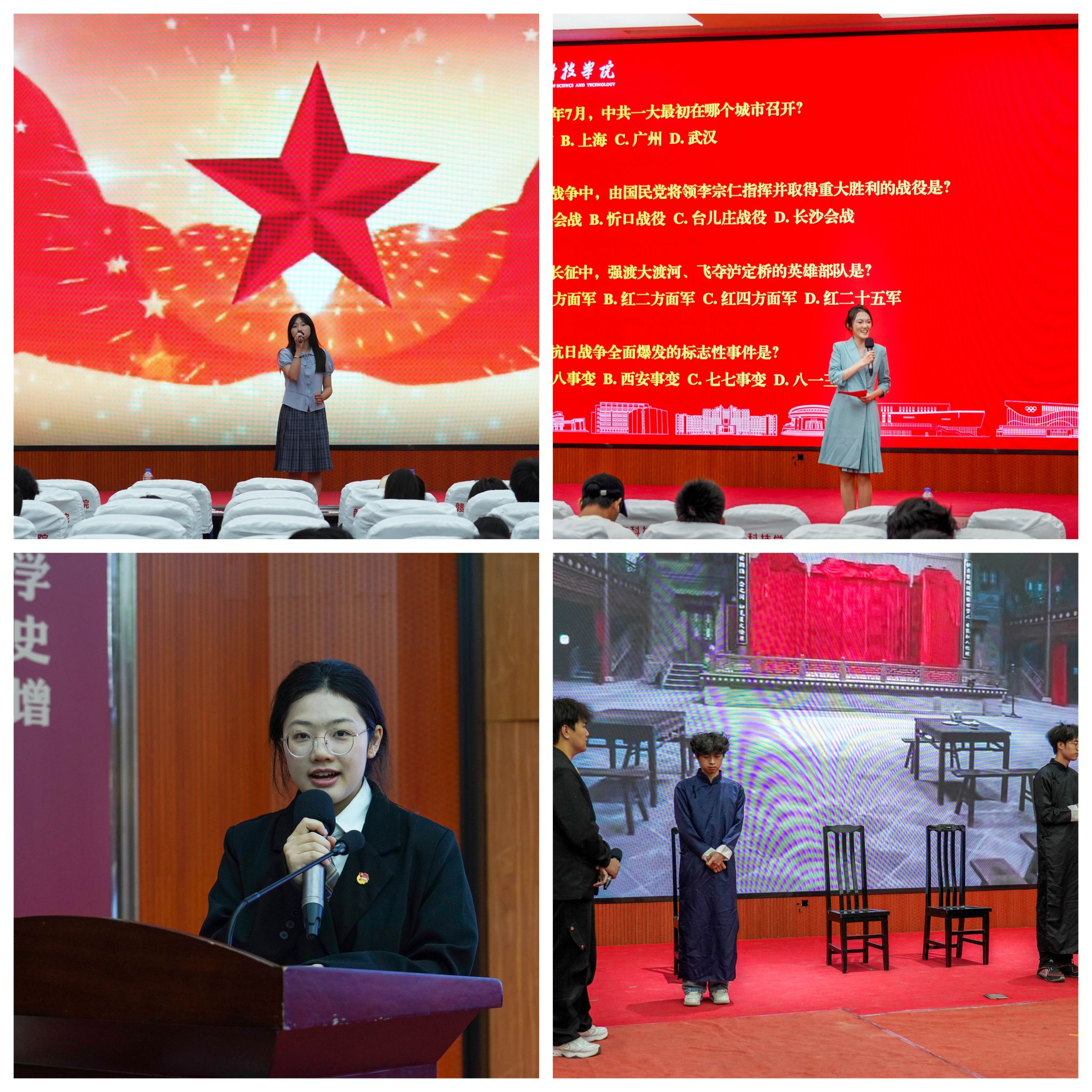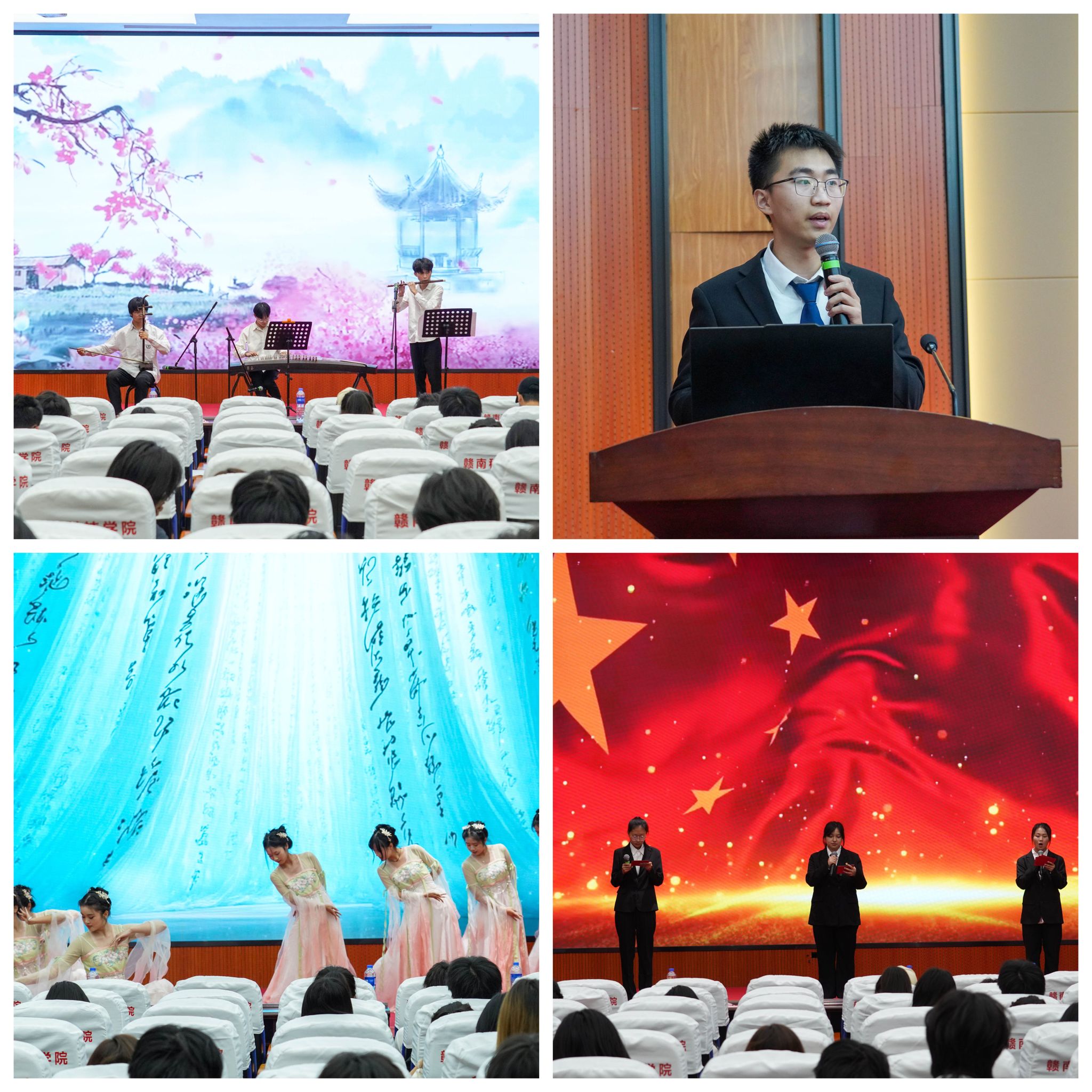 校团委器乐队胡济梁、曾曦、张俊杰带来器乐合奏《寄明月》,融合传统与现代,谱写爱国长歌。视觉232团支书杨彦坤讲授团课《苏区红魂耀千秋》,弘扬抗战精神。徐文婷、张晓晗演绎古典舞《盛世》,展现时代瑰丽。yl6809永利YL集团“薪火”宣讲团朗诵《薪火相传担重任》,传承先辈精神。