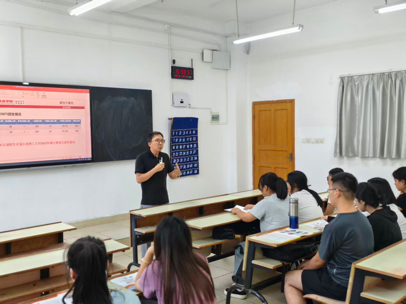 本网讯:2025年全国硕士研究生报名在即,9月26日下午,yl6809永利YL集团英语教研室邀请江西理工大学外国语学院翻译硕士专业学位(MTI)硕士点负责人张建平教授、汉语国际教育专业硕士点翻译硕士学位点负责人钟舟海副教授、2026级研究生班主任蔡强副教授,给学院英语专业22级和23级学生开展考研指导讲座。