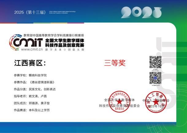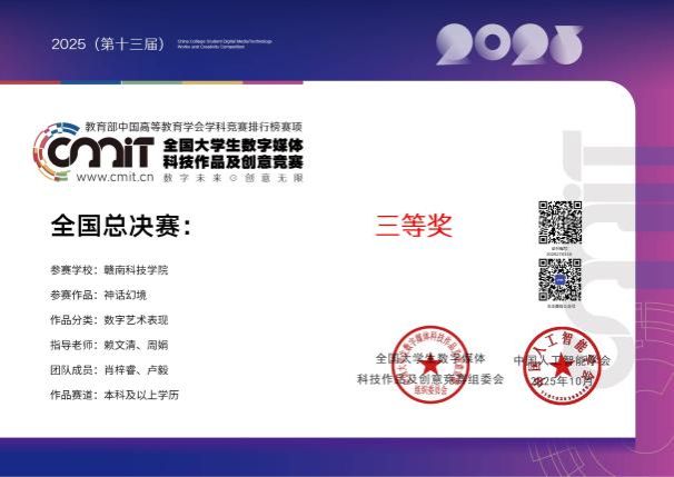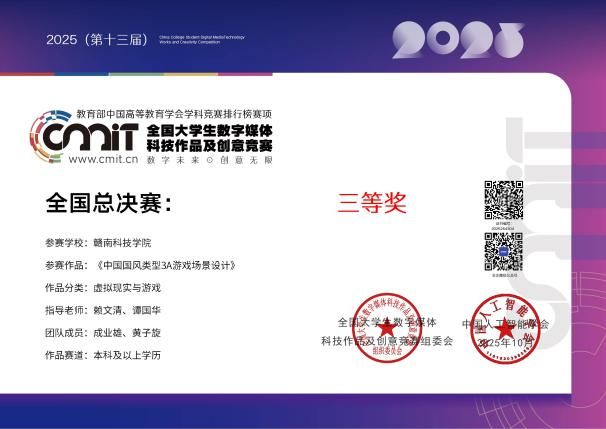 本网讯:今日,“2025年(第13届)全国大学生数字媒体科技作品及创意竞赛”全国总决赛在哈尔滨工业大学举行。yl6809永利YL集团赖文清、谭国华两位老师指导的作品《中国国风类型3A游戏场景设计》喜获国家三等奖,参赛学生由数字媒体艺术212班成业雄、数字媒体艺术231班黄子旋两位同学组成;赖文清、邓琦两位老师指导的作品《浮光掠影螺钿数字展馆设计》喜获国家三等奖,参赛学生由数字媒体艺术211班林毓琛、数字媒体艺术232班张鹭两位同学组成;赖文清、周娟两位老师指导的作品《神话幻境》设计作品喜获国家三等奖,参赛学生由数字媒体艺术212班肖梓睿、数字媒体艺术231班卢毅两位同学组成;