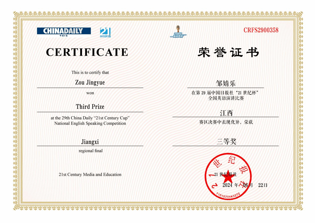 6月22日,第29届中国日报社“21 世纪杯”全国英语演讲比赛江西赛区复赛在江西农业大学顺利举行,我校自动化222班秦亮,英语222班邹婧乐分获江西赛区二等奖、三等奖。秦亮同学将和来自全省其它高校的九位同学代表江西赛区参加十月份在北京举办的全国半决赛。