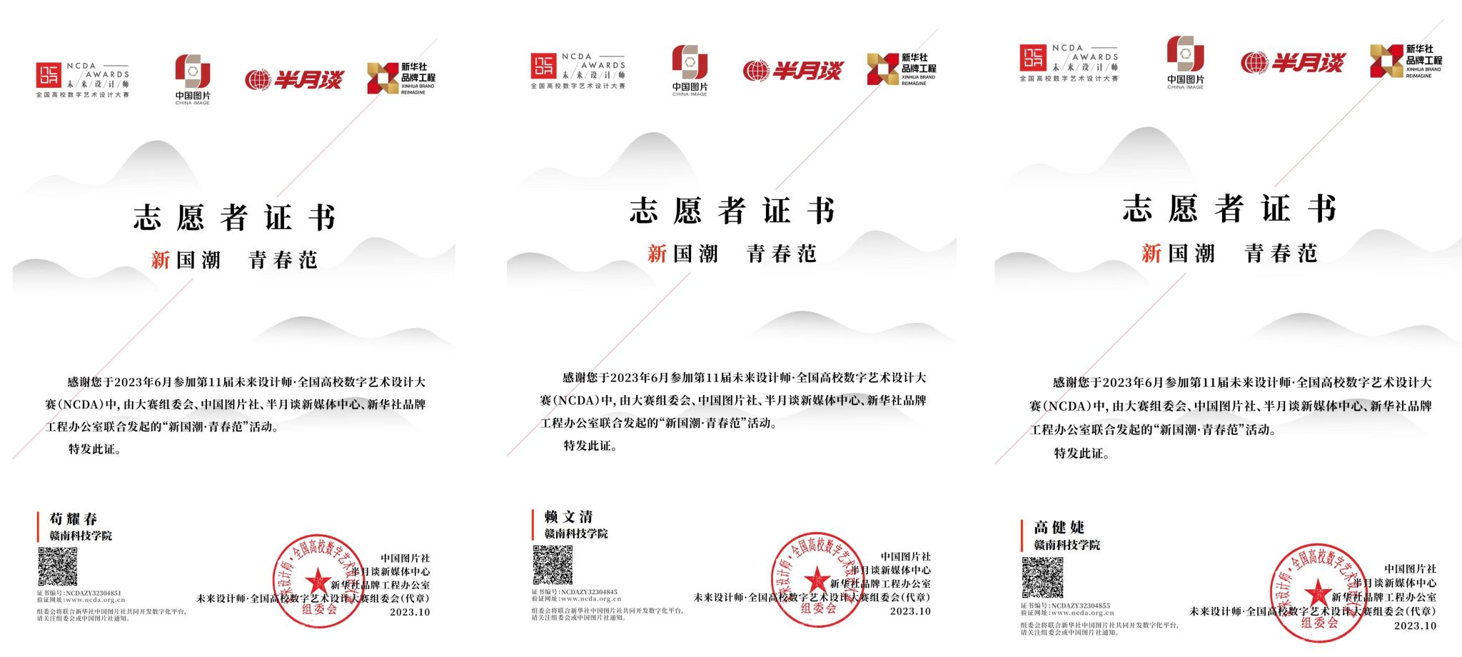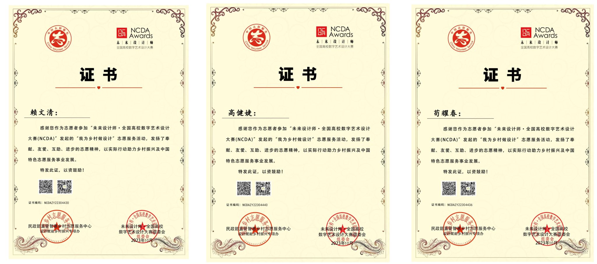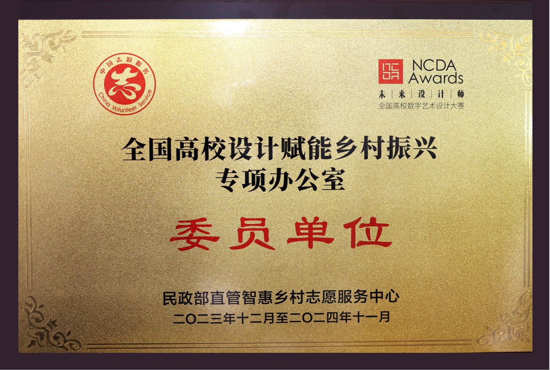 另外,我校师生作为志愿者参加了“未来设计师·全国高校数字艺术设计大赛(NCDA)”发起的“我为乡村做设计”志愿服务活动,发扬了奉献、友爱、互助、进步的志愿精神,以实际行动助力乡村振兴及中国特色志愿服务事业发展。我校被全国高校设计赋能乡村振兴专项办公室授予“委员单位”牌,为建设美丽乡村、推动乡村振兴发挥积极的作用,贡献设计的力量。