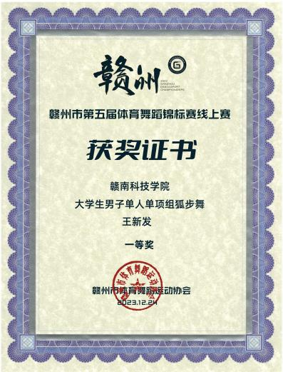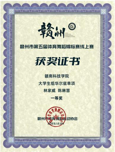 近日,2023年第五届赣州市体育舞蹈锦标赛比赛成绩揭晓,我校体育舞蹈队在赣州市第五届体育舞蹈锦标赛中捷报频传,在朱少刚老师的指导下取得了18项一等奖的好成绩。其中社体212班林家威与舞伴陈玲慧获得大学生华尔兹组冠军,社体212班王新发与社体201班刘璇搭档斩获大学生探戈舞冠军,社体201班刘旺弟拿下大学生女子单人单项华尔兹、狐步舞和维也纳华尔兹3个组别的冠军,社体212班许乾超同学在男子单人单项华尔兹和快步舞上获得两项冠军。