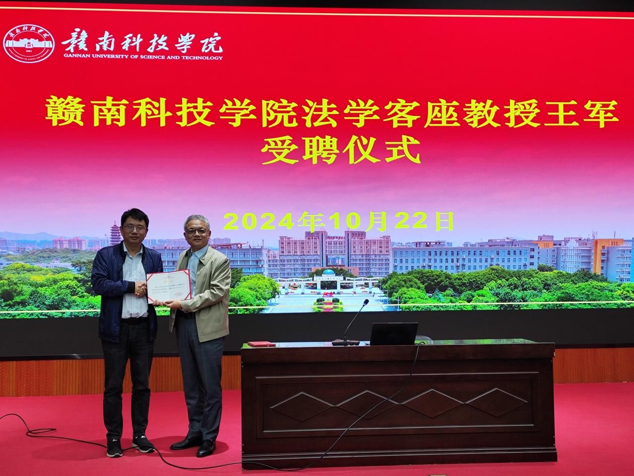 讲座后,举行了yl6809永利检测中心法学客座教授受聘仪式,yl6809永利YL集团教学主任何建军为新聘任的客座教授王军颁发聘书。