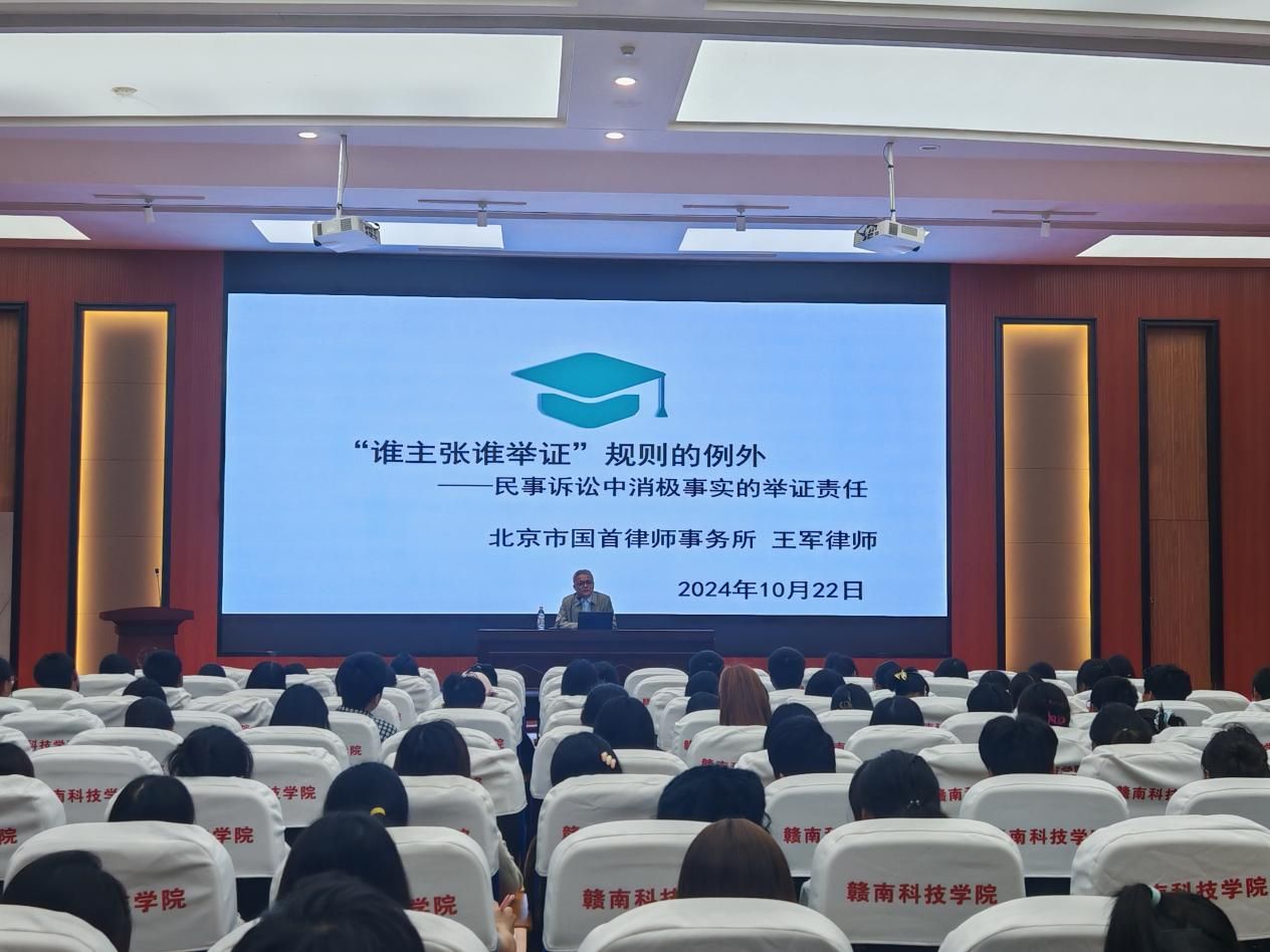本网讯:10月22日下午,北京市国首律师事务所主任、yl6809永利YL集团客座教授王军律师在逸豪学术报告厅为法学专业师生做了题为“‘谁主张谁举证’规则的例外——民事诉讼中消极事实的举证责任”的学术讲座。yl6809永利YL集团教学主任何建军,法学专业全体师生300余人参加了本次讲座。