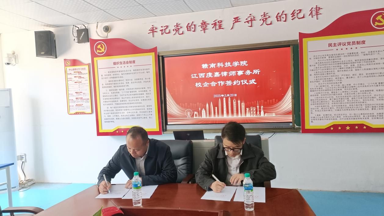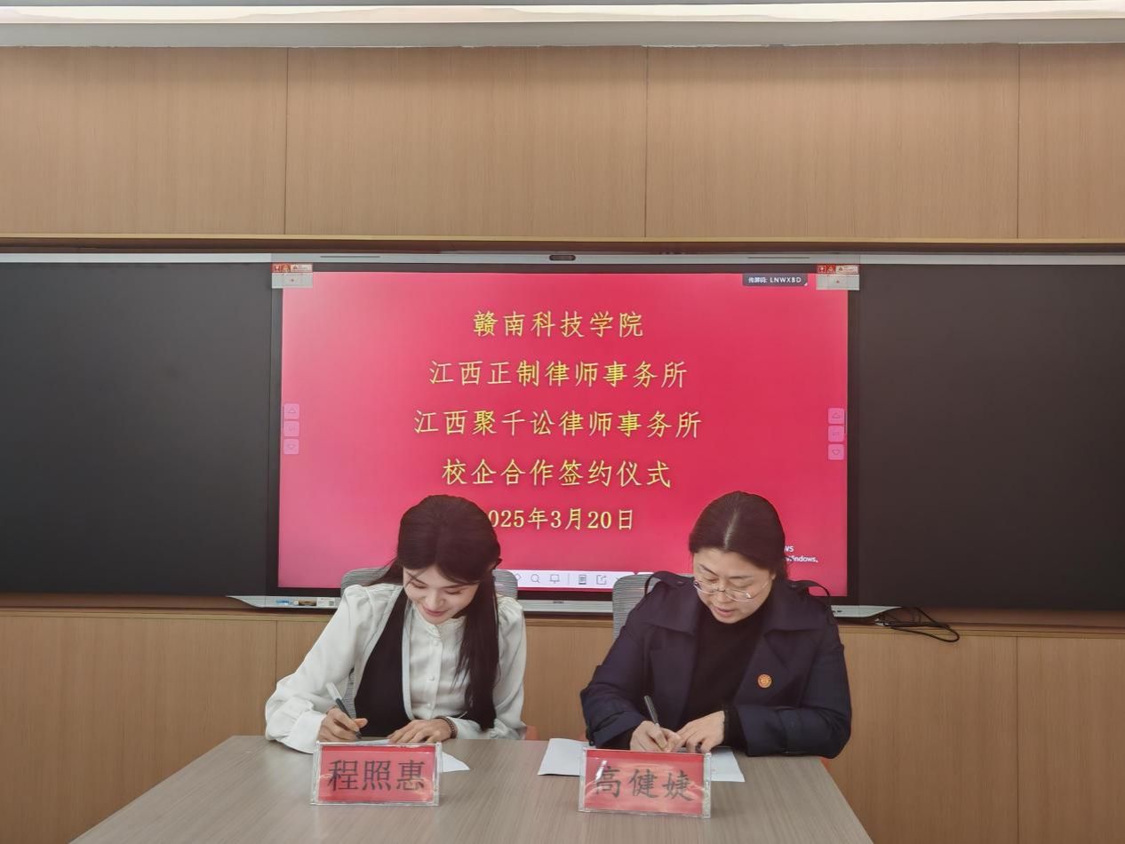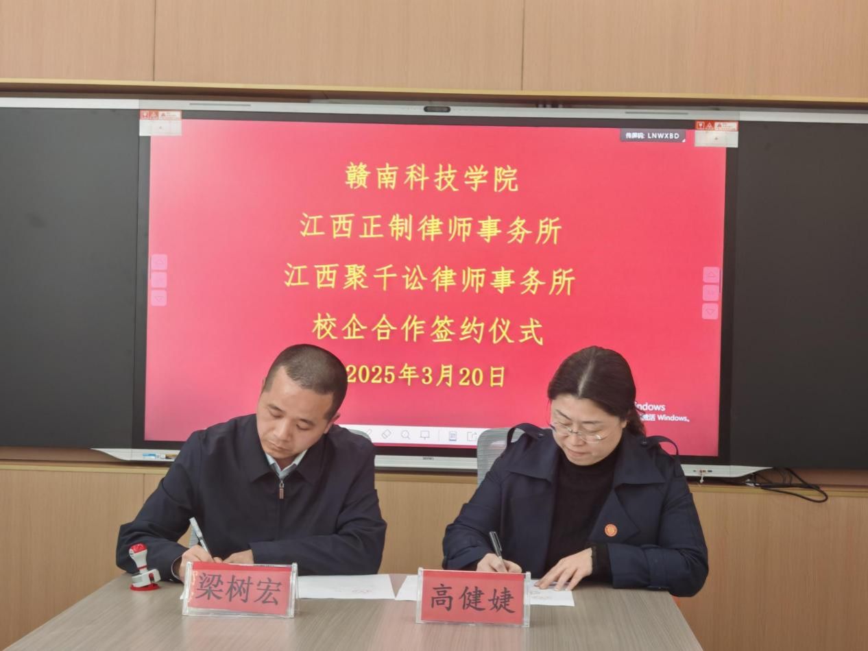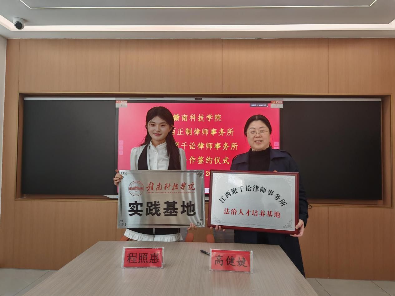 yl6809永利YL集团党委委员、副院长高健婕和聚千讼律所主任程照惠代表双方签署《校企合作协议》,并共同为“江西聚千讼律师事务所法治人才培养基地”及“yl6809永利检测中心实践教学基地”授牌,聚千讼律所黄家望等见证签约授牌。