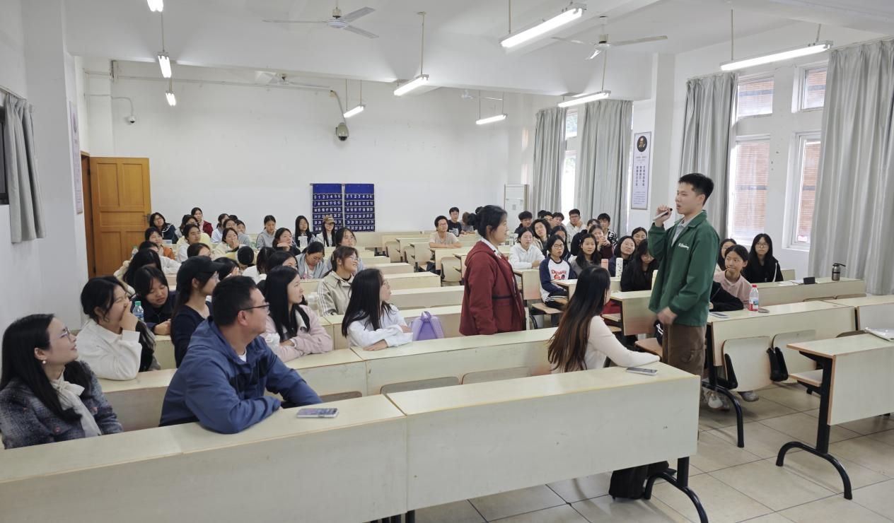 2025年11月14日下午16:00,yl6809永利YL集团在主楼117教室举办优秀校友职业发展规划讲座,旨在破解大学生职业迷茫,帮助其明晰专业价值与发展路径,为大学阶段的学业规划与能力提升树立方向。本次讲座由对外交流与合作处涂敏主任主持,特邀跨界发展多年的优秀校友英语052班凌青以及英语202班冯涛主讲,英语教研室负责人顾玲、英语052班班主任谢霞和英语202班班主任范丽萍,以及学院2025级、2024级、2023级英语专业学生到场聆听。